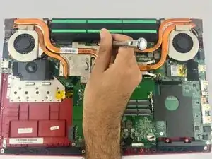 Удалите систему охлаждения, отвинтив четырнадцать винтов, которые ее удерживают.