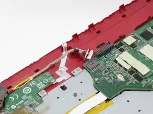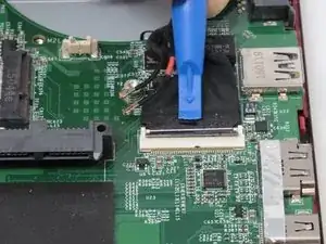 Используйте пластиковую открывалку, чтобы поддеть разъём, удерживающий кабель дисплея, и отключить его.