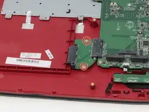 Используя отвёртку Phillips #0, удалите два винта длиной 4 мм, которые крепят разъём SATA.