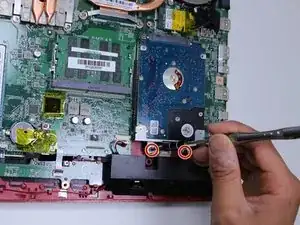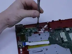 Используя отвёртку Phillips #0, удалите три винта-стойки длиной 3,8 мм, которые фиксируют материнскую плату, и аккуратно извлеките её.