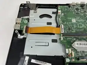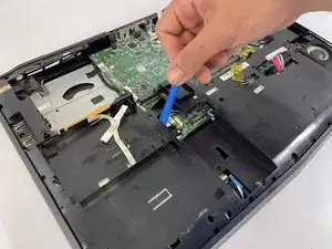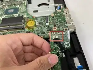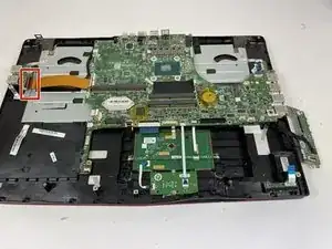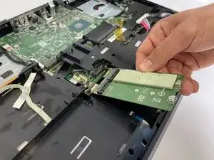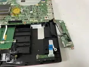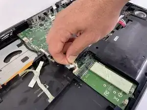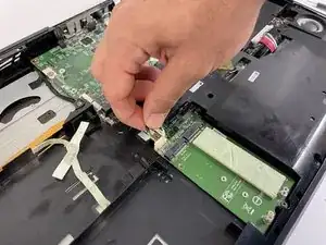 Дочерняя плата всё ещё присоединена к ноутбуку, поэтому просто отведите её вправо.