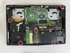 Снимите пять винтов 5.6 мм, удерживающих материнскую плату, используя отвертку JIS #1.