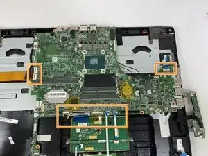 Отключите шлейфы дисплея, клавиатуры, трекпада и дочерней платы USB от материнской платы.