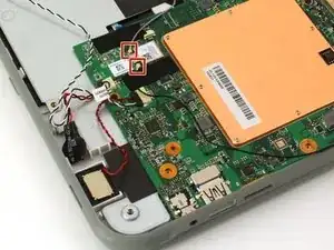 С помощью лопатки аккуратно отсоедините чёрный и серый провода, отщёлкнув их с беспроводной карты.