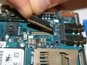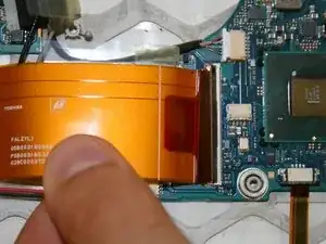 Используйте пластиковый инструмент для вскрытия, чтобы откинуть чёрный фиксатор ZIF-разъёма, затем отсоедините большой оранжевый шлейф.