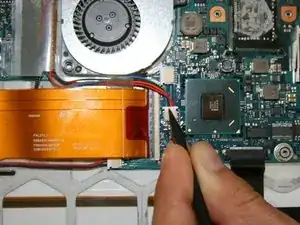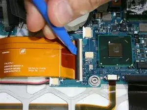 Используйте пластиковый инструмент для открывания, чтобы отсоединить чёрную ленточную шлейф от материнской платы.