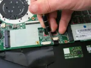 Потяните широкий разъём аккумулятора в направлении к аккумулятору, чтобы отключить его от материнской платы.