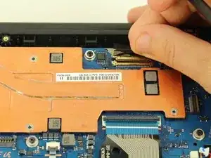 Используйте монтажный инструмент iFixit, чтобы осторожно поддеть корпус у вентиляционного отверстия со стороны петли Chromebook.