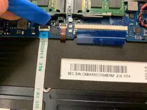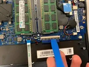Аккуратно потяните за синюю язычок, прикреплённый к кабелю в верхнем правом углу материнской платы, чтобы отсоединить кабель.
