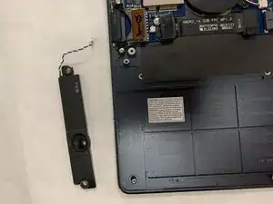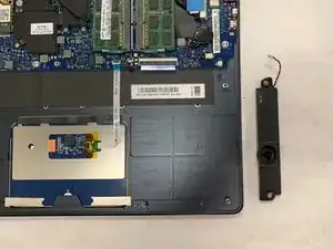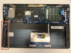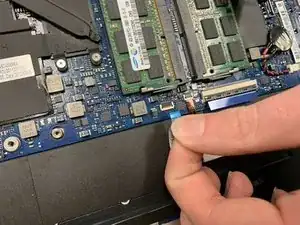 Аккуратно приподнимите левую сторону материнской платы и сдвиньте плату влево, чтобы отсоединить её от корпуса ноутбука.