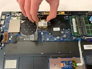 Снимите два винта Phillips #00 длиной 2,5 мм, крепящие Wi‑Fi модуль к материнской плате.