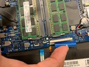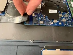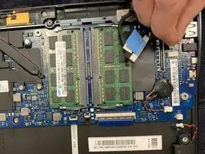 Аккуратно потяните за собранный разъём кабеля в верхнем правом углу платы, чтобы отсоединить его от материнской платы.