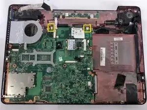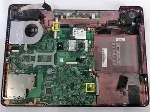 Отвинтите 1 винт, обозначенный жёлтым кругом, отверткой PH1. Этот винт длиннее и тоньше предыдущих.