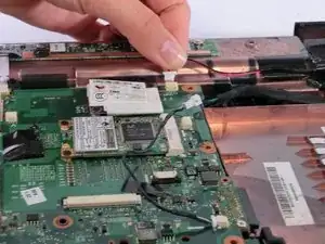 Отвинтите два винта, крепящие вентилятор к ноутбуку. Для винта рядом с динамиком используйте PH1, для второго винта используйте PH0.
