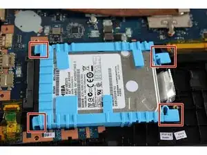 Найдите четыре боковые защёлки синей пластиковой рамки, которые фиксируют жёсткий диск на месте.