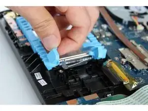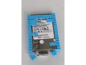 Когда устройство открыто снизу, найдите ярко-синюю пластиковую рамку, в которой размещён жёсткий диск.