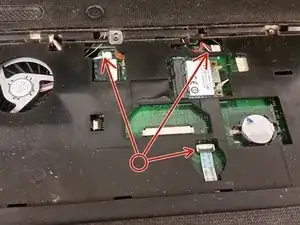 Отключите три кабеля с панели для ладоней от материнской платы: кабель кнопки питания, кабель динамиков и кабель тачпада.