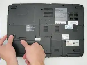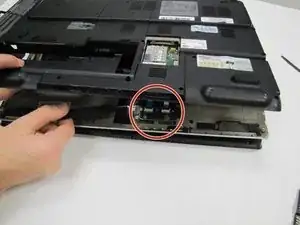 Сдвиньте защёлку для извлечения батареи в направлении к фиксатору. Батарея должна приподняться и выйти из гнезда в ноутбуке.