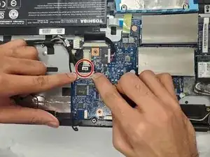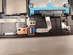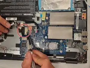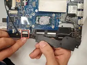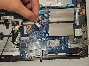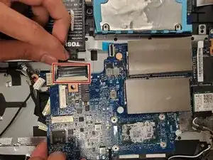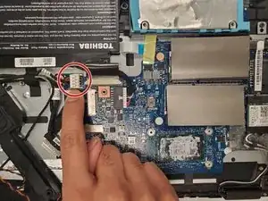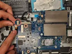 Отсоедините кабель, соединяющий материнскую плату с корпусом ноутбука (расположен на правой стороне материнской платы).