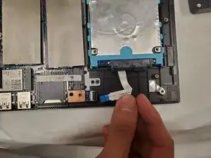 Снимите разъём, откинув чёрный переключатель вверх и вытянув кабель с синей полоской наружу.