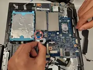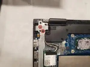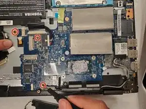 С помощью отвёртки Phillips #00 отвинтите три винта, фиксирующие материнскую плату к корпусу ноутбука (расположены на прямоугольных/круглых медных контактных поверхностях).