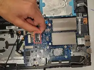Снимите модуль беспроводной связи (белый прямоугольник, прикреплённый к поверхности материнской платы).