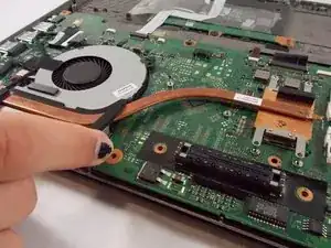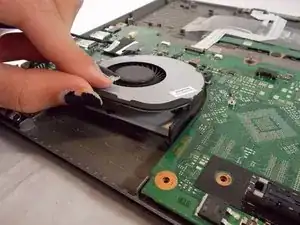 Потяните вниз, в сторону нижней части ноутбука, чтобы отсоединить кабель вентилятора от его разъёма на материнской плате.