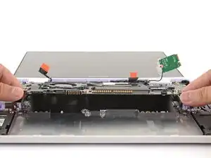 Поднимите её, чтобы открыть верхнюю панель от основания ноутбука.