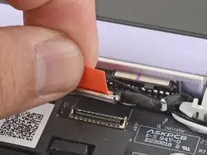 Пальцами захватите оранжевую язычок аккумулятора и поднимите его прямо вверх, чтобы отключить аккумулятор.