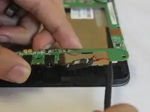 Используйте пластиковую лопатку, чтобы отсоединить соединение динамиков и материнской платы, как показано на изображении.