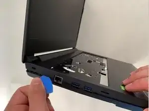 Вставьте открывалку iFixit в верхний паз клавиатуры и протяните до конца.
