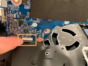Аккуратно откиньте фиксатор чёркого кабеля клавиатуры и выведите его из разъёма.
