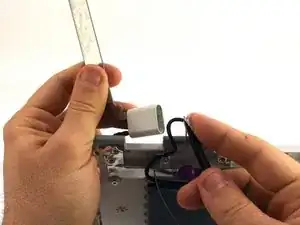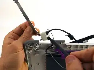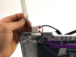 Используйте пластмассовую лопатку, чтобы поддеть и вынуть белый пластиковый фиксатор кабеля из корпуса петли.