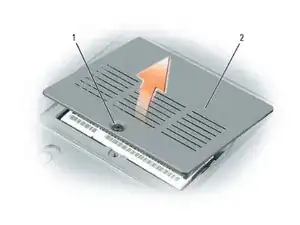Переверните компьютер вверх дном, ослабьте фиксирующий винт крышки модуля памяти (см. изображение) и снимите крышку.