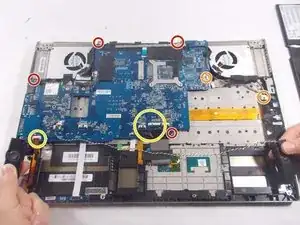 Отвинтите 4 винта Philips #0 с шагом 1.2 мм, крепящие материнскую плату к корпусу ноутбука.