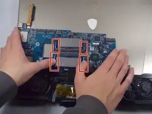 Оттяните серебристые защёлки, чтобы освободить модули оперативной памяти.