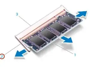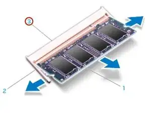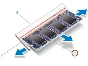 Используя кончики пальцев, осторожно раздвиньте пружинные зажимы на разъеме модуля памяти, пока модуль не поднимется.