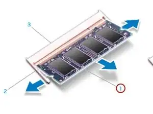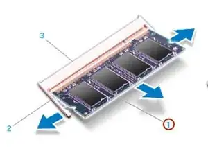 Аккуратно раздвиньте пружинные зажимы на разъеме модуля памяти с помощью кончиков пальцев, пока модуль не поднимется.