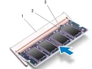 Запустите модуль памяти в разъем под углом 45 градусов и нажмите на модуль памяти вниз, пока он не защелкнется на месте. Если щелчка не слышно, удалите модуль памяти и установите его снова.