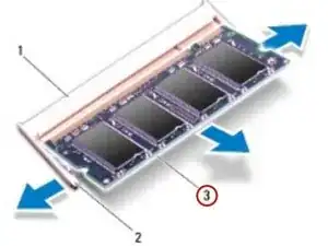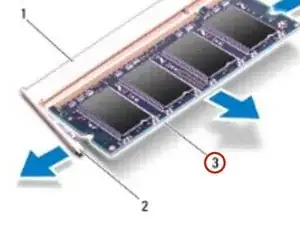 ОСТОРОЖНО: Чтобы избежать повреждения разъема модуля памяти, не используйте инструменты для раскрытия зажимов, удерживающих модуль памяти.