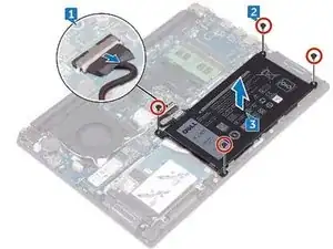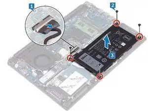 Удалите четыре винта (M2x3), которые закрепляют батарею на панели и сборке клавиатуры.