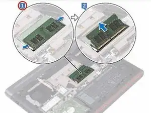 Аккуратно раздвиньте фиксирующие зажимы на каждом конце разъёма для модуля памяти кончиками пальцев, пока модуль памяти не поднимется.