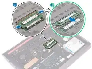 Используйте кончики пальцев, чтобы осторожно расстегнуть зажимы с каждого конца слота для модуля памяти, пока модуль памяти не поднимется.