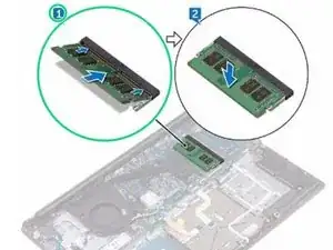 Плотно вставьте модуль памяти в слот под углом и нажмите на модуль памяти, пока он не щелкнет на месте.