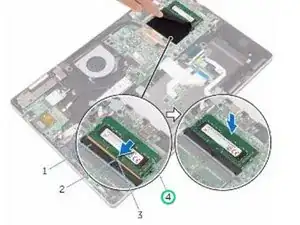 Вставьте модуль памяти плотно в слот под углом и нажмите на модуль памяти, пока он не щелкнет на месте.