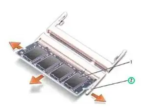 Аккуратно разведите фиксаторы с каждой стороны разъёма модуля памяти кончиками пальцев, пока модуль не приподнимется.