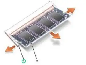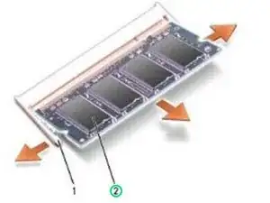 Аккуратно раздвиньте фиксаторы по концам разъёма модуля памяти кончиками пальцев, пока модуль не выйдет из посадочного места.