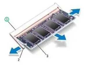 С помощью кончиков пальцев аккуратно расстегните зажимы на каждом конце разъема модуля памяти, пока модуль не поднимется.
