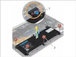 После извлечения аккумулятора переверните компьютер, откройте дисплей и нажмите кнопку питания примерно на пять секунд, чтобы разрядить системную плату.