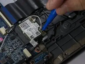 Найдите модуль беспроводной сети. Он расположен над чёрным ленточным кабелем, под клеммами аккумулятора.